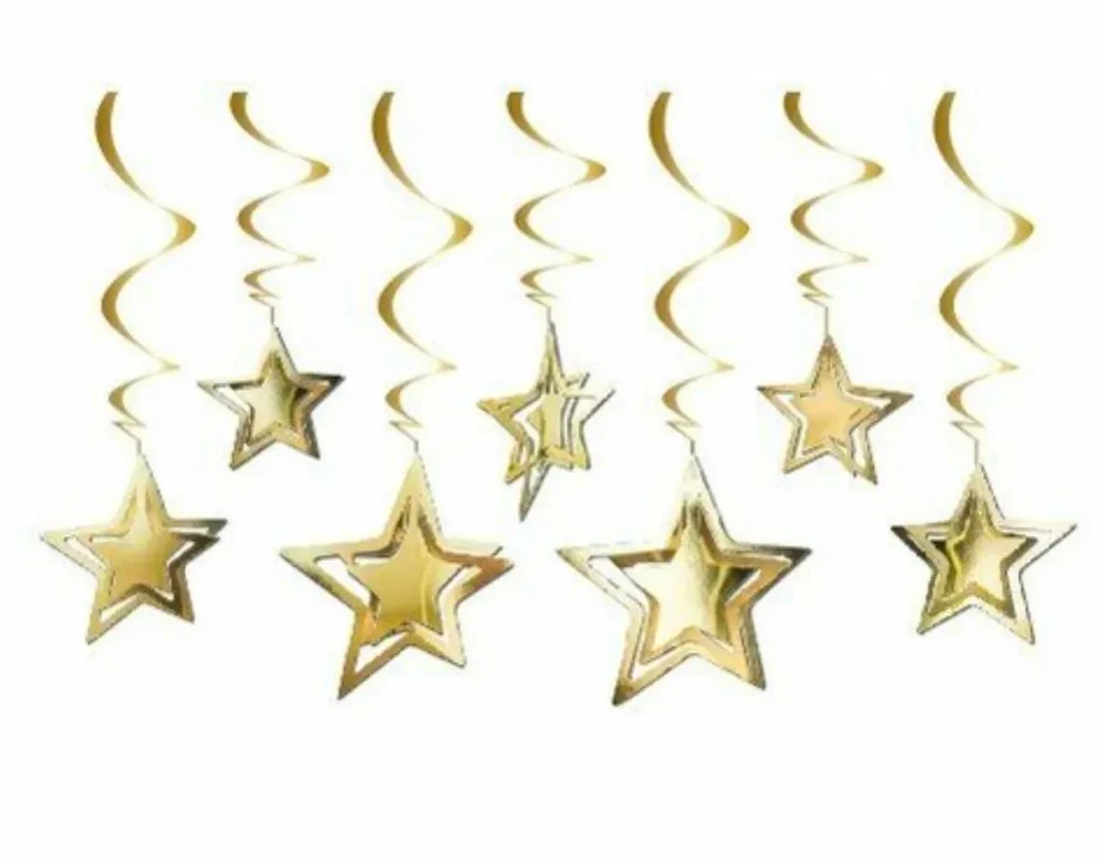 Gold renkli 3D yıldız tavan süsleri ile kutlamalarınıza şıklık ve zarafet katın! Paket içerisinde farklı boyutlarda toplam 10 adet yıldız süs bulunur. Ürün, spiral ve kılçık malzemelerle kolayca tavana, avizeye veya istediğiniz alana asılabilir. Katlanabilir tasarımı sayesinde yıldızlara kolayca form verilir. Doğum günü, düğün, yılbaşı veya özel etkinliklerde göz alıcı bir dekorasyon için ideal bir seçimdir.