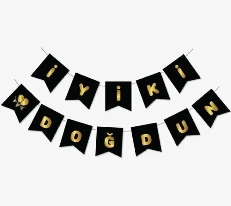 Açıklama: Siyah zemin üzerine altın yaldızlı yazılarla tasarlanmış bu banner, doğum günü kutlamalarına şıklık katıyor. Masa arkası, duvar veya fotoğraf alanı için mükemmel bir dekoratif çözüm. Özellikler: