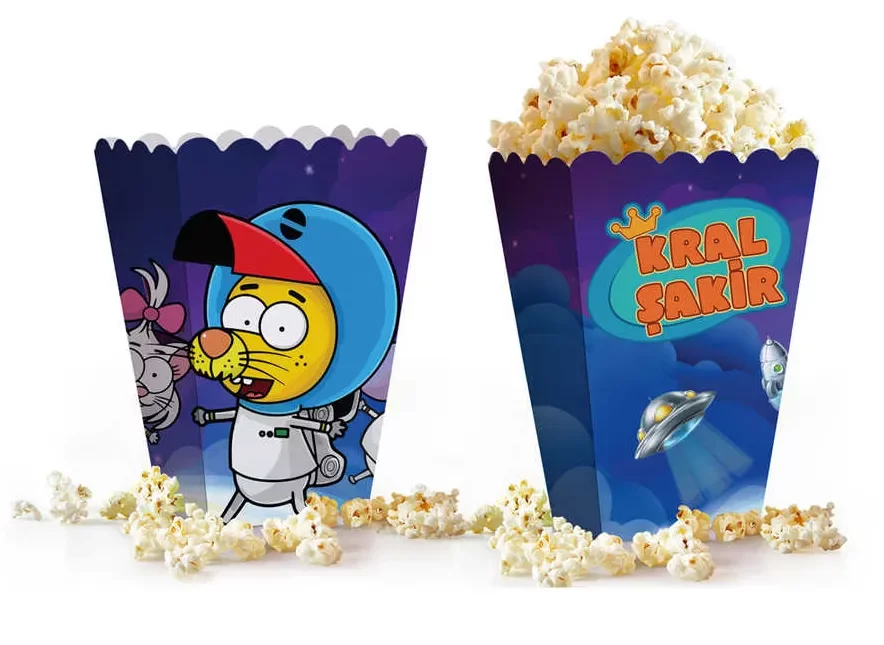 Kral Şakir Uzayda temalı mısır kutuları, çocuk partilerinde eğlenceli ve renkli bir atmosfer yaratmak için tasarlanmıştır. 8’li paket halinde sunulan bu kutular, dayanıklı karton malzemeden üretilmiştir ve mısır, cips veya küçük atıştırmalıklar için idealdir. Üzerindeki canlı uzay temalı Kral Şakir tasarımı sayesinde doğum günü partileri, etkinlikler ve özel kutlamalarda çocukların ilgisini çeker.