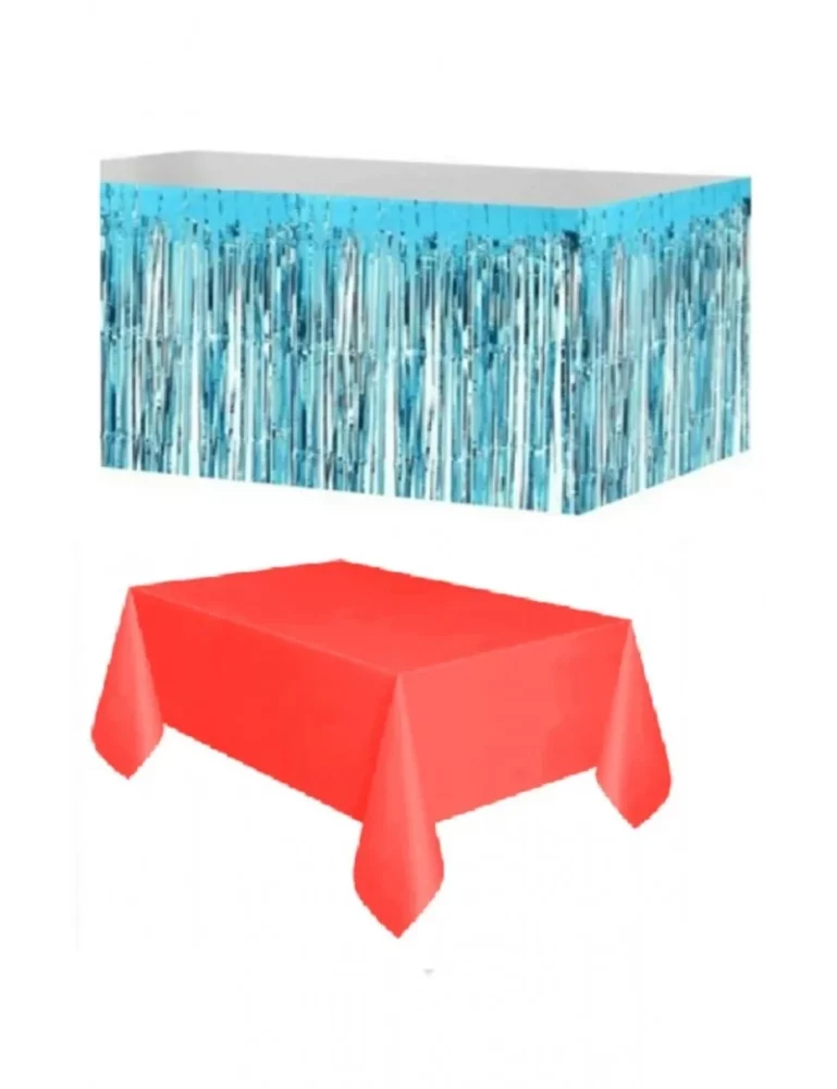 Mavi metalize masa eteği ve kırmızı plastik masa örtüsü seti, etkinliklerinizde canlı ve dikkat çekici bir dekorasyon sağlar. Parlak metalize püsküllü masa eteği masanıza hareketli bir görünüm katarken, kırmızı masa örtüsü enerjik ve şık bir atmosfer oluşturur. Parti, doğum günü, nişan, düğün ve özel davetlerde masalarınızı hızlı ve pratik şekilde hazırlamak için ideal bir ikili.
